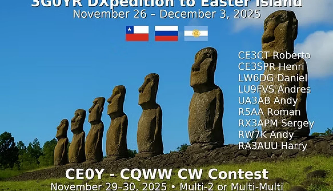 Entre 26 de novembro e 3 de dezembro de 2025, a equipe da expedição 3G0YR & CE0Y – Ilha de Páscoa estará ativa com foco em dar o máximo de novas entidades, bandas e modos para radioamadores do mundo todo. Durante esse período, a operação principal usará o indicativo 3G0YR, enquanto no fim de semana do concurso CQ WW CW 2025 (29–30 de novembro) o time passa a operar com o indicativo de contest CE0Y.