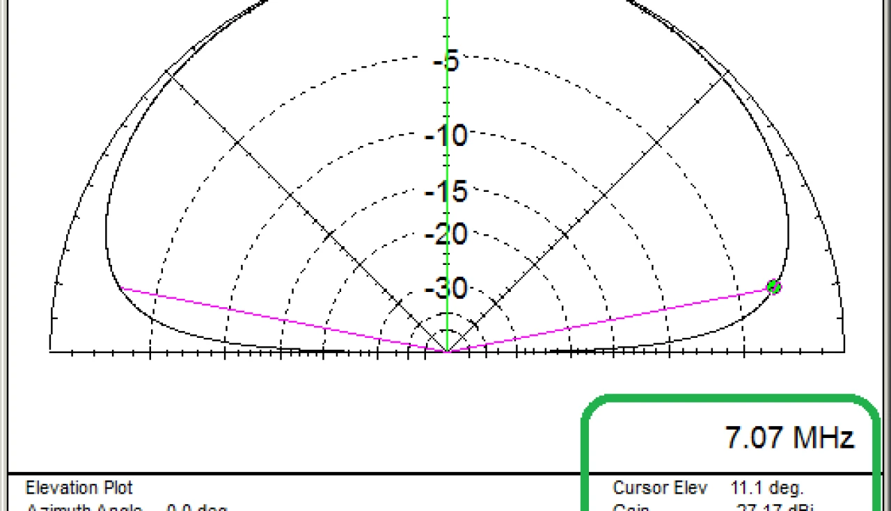 O ângulo -3dB é aproximadamente 6-8 graus em relação ao horizonte, produzindo um ganho absoluto de aproximadamente -2 a 0 dBi. Este é um excelente ângulo para DX de curto a médio alcance, mantendo boa sensibilidade para contatos domésticos também.