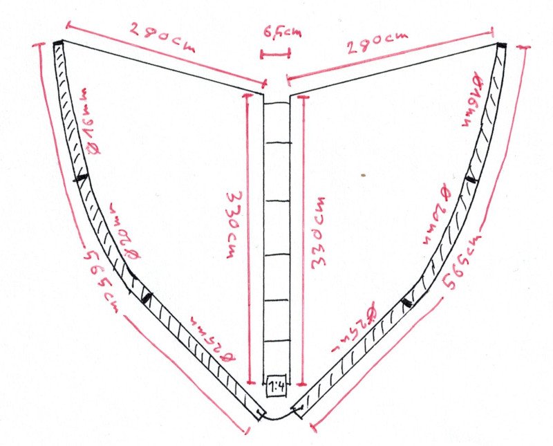 O projeto original descreve dois tubos de alumínio de 5,65 m, posicionados em ângulo reto, que formam a maior parte dos elementos radiantes da antena.