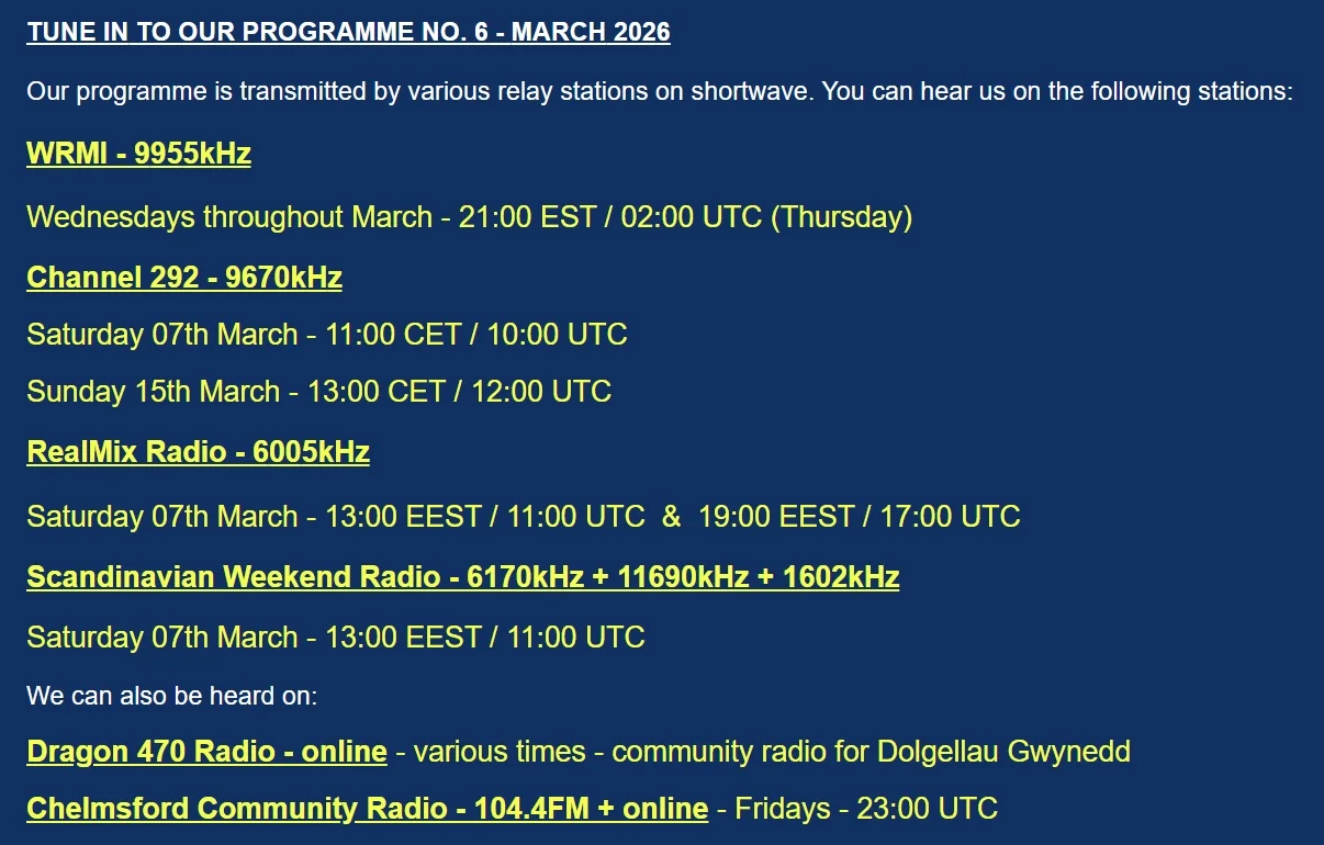 Como de costume, o programa será transmitido em ondas curtas graças aos parceiros de retransmissão em SW. Para quem prefere som sem chiados, há a opção online, disponível sem interferências em www.sjtjradio.com.