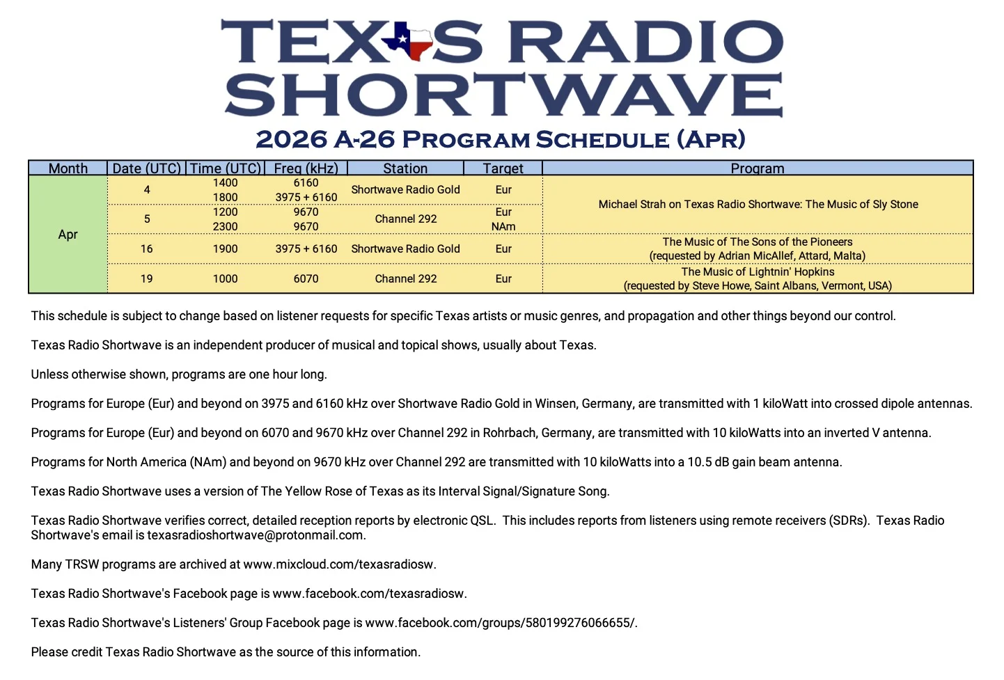 O cronograma de abril de 2026 da Texas Radio Shortwave foi compartilhado pelo colaborador Terry (N5RTC) no SWLing Post. A publicação inclui uma imagem com o mapa de horários e faixas; segundo a postagem, é possível clicar na imagem para ampliar e conferir os detalhes do schedule.