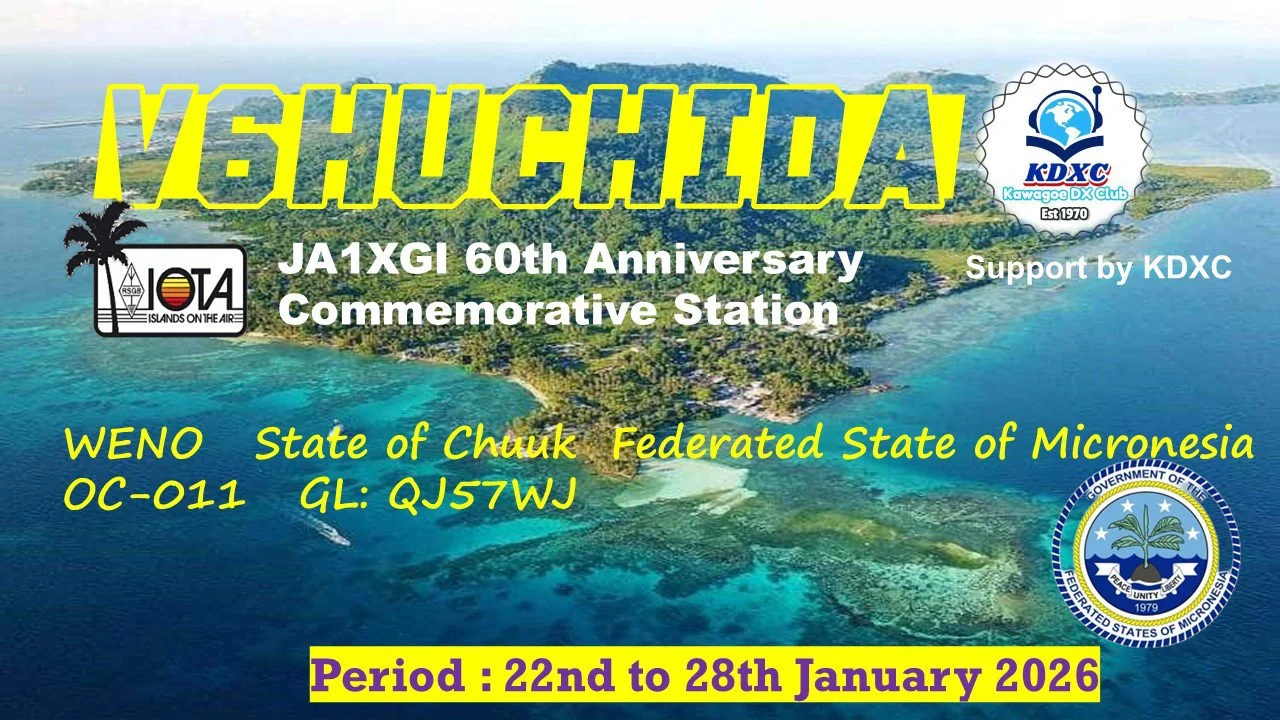 O radioamador Haru JA1XGI, celebrando seis décadas de dedicação ao rádio, anunciou sua participação especial como V6HUCHIDA a partir de Chuuk, um estado nas Ilhas Carolinas, parte dos Estados Federados da Micronésia. A ativação ocorrerá entre os dias 22 e 28 de janeiro de 2026.