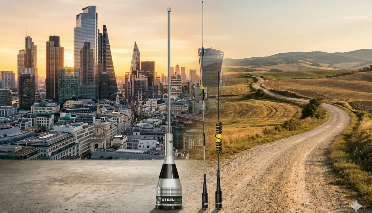 Antenas dual band compactas, como a Steelbras AP0188 e equivalentes, oferecem um excelente balanço entre tamanho, robustez e desempenho. Por utilizarem uma configuração simples em VHF, são discretas, resistem bem a vento e uso diário e funcionam tanto na cidade quanto na estrada. São ideais para quem quer algo confiável sem complicações.
