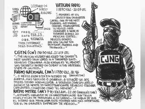 O cartunista e colaborador do SWLing Post, Carlos Latuff, publicou um relatório ilustrado com registros de escuta de rádio sobre a cobertura da suspeita morte do líder do cartel conhecido como “El Mencho”. O material reúne trechos transmitidos por emissoras internacionais como Vatican Radio, CGTN Radio, Rádio Nacional e Radio Mitre.