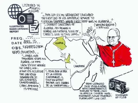 O cartunista político e colaborador do SWLing Post, Carlos Latuff, publicou um relatório ilustrado de escuta de rádio reunindo captações da Vatican Radio e da BBC sobre a chegada do Papa Leão XIV a Camarões, marcada como a segunda etapa de sua viagem apostólica. O material combina comentário visual e gravações de áudio para documentar a transmissão internacional.