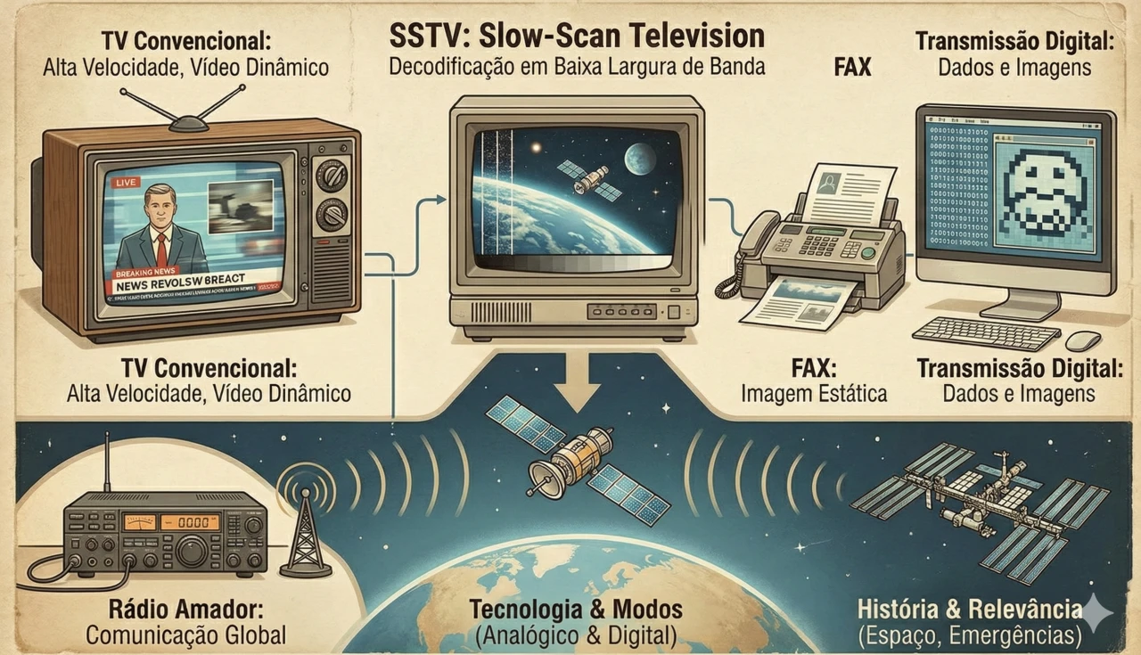 A comparação mais óbvia é com a televisão de varredura rápida (FSTV), ou o que chamamos de televisão convencional ou ATV (Amateur Television). A diferença é monumental: a FSTV transmite imagens em movimento, requerendo uma largura de banda de aproximadamente 6 MHz. Isso é cerca de 2.000 vezes mais do que um canal de voz de 3 kHz usado pela SSTV. A FSTV opera com uma taxa de varredura de cerca de 15.732 linhas por segundo, enquanto a SSTV varia de 1 a 15 linhas por segundo (60 a 900 LPM), como aponta o PY4ZBZ Tutorial SSTV (19). Essa discrepância na largura de banda e na velocidade de varredura significa que a FSTV é ideal para vídeo dinâmico, rico em detalhes e cores, mas impraticável para transmissões de rádio de longa distância em bandas de ondas curtas devido à sua exigência de espectro.