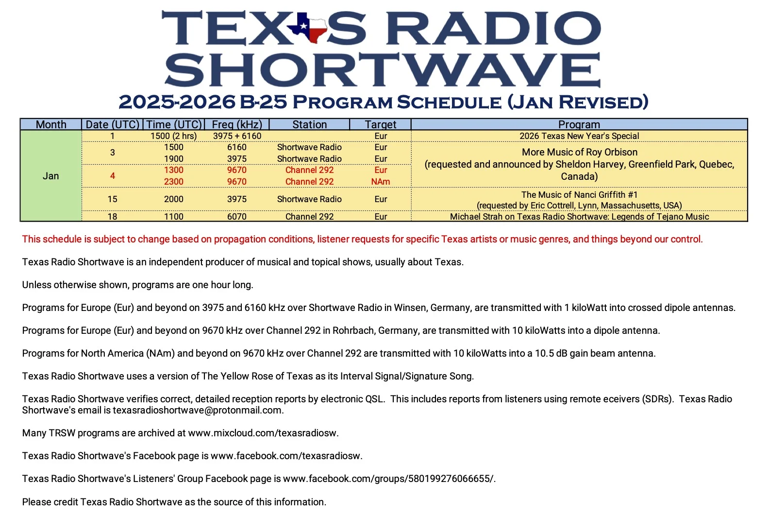 Por ser uma escala de última hora, alterações podem ocorrer sem aviso prévio. Acompanhe o SWLing Post e outras fontes de radioescuta para atualizações e confirmações.